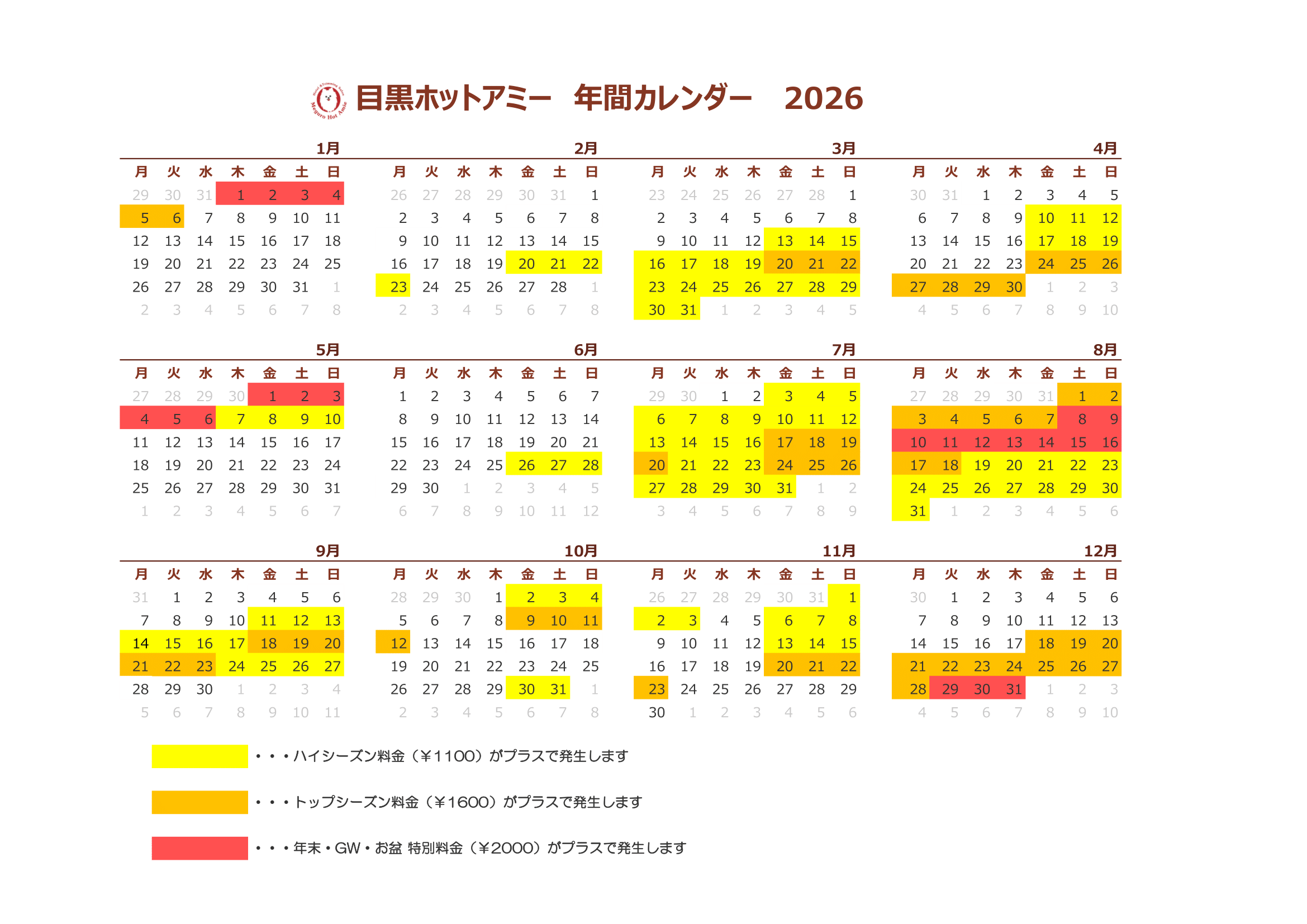 - 繁忙期に関しましては、初回割引対象外となり、1泊につき割増料金が発生致しますのでご了承ください。なお、トップシーズン、ハイシーズンの追加料金、スケジュールに関しましては、以下ご確認よろしくお願い致します。
